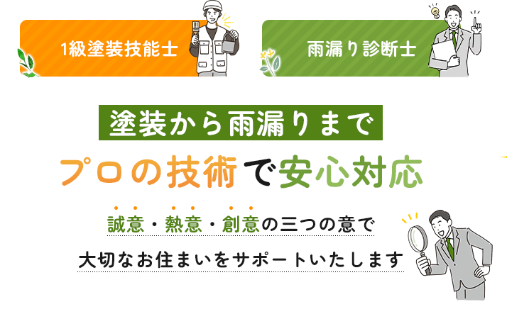 一級塗装技能士や雨漏り診断士の資格を持つスタッフが、施工・調査にお伺いします。